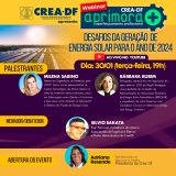 Vem aí o primeiro Aprimora+ de 2024! No dia 30 de janeiro (terça-feira), às 19h, o Crea-DF promoverá a palestra online “Desafios da geração de energia solar para o ano de 2024”.