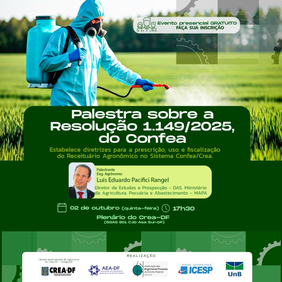 A Câmara Especializada de Agronomia do CREA-DF (CEAgro/DF) realizará no dia 02 de outubro, às 17h30, no Plenário do Conselho, a palestra “Resolução 1.149/2025, do Confea”, que estabelece diretrizes para a prescrição, uso e fiscalização do Receituário Agronômico no âmbito do Sistema Confea/Crea.