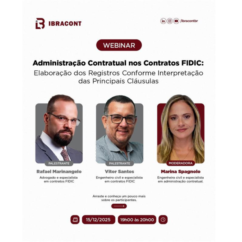 "Administração Contratual nos Contratos FIDIC: Elaboração dos Registros Conforme Interpretação das Principais Cláusulas"Nesta edição, um bate-papo essencial entre os renomados especialistas: Rafael Marinangelo e Vitor Santos, como palestrantes e Marina Spagnolo, como moderadora.