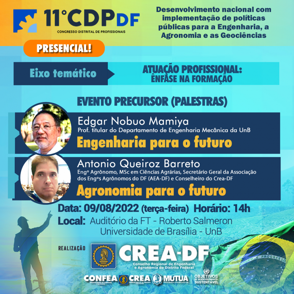 Com o eixo temático ATUAÇÃO PROFISSIONAL, o evento acontecerá no auditório Roberto Salmeron da Faculdade de Tecnologia (FT) da Universidade de Brasília - UnB e contará com a presença dos palestrantes: