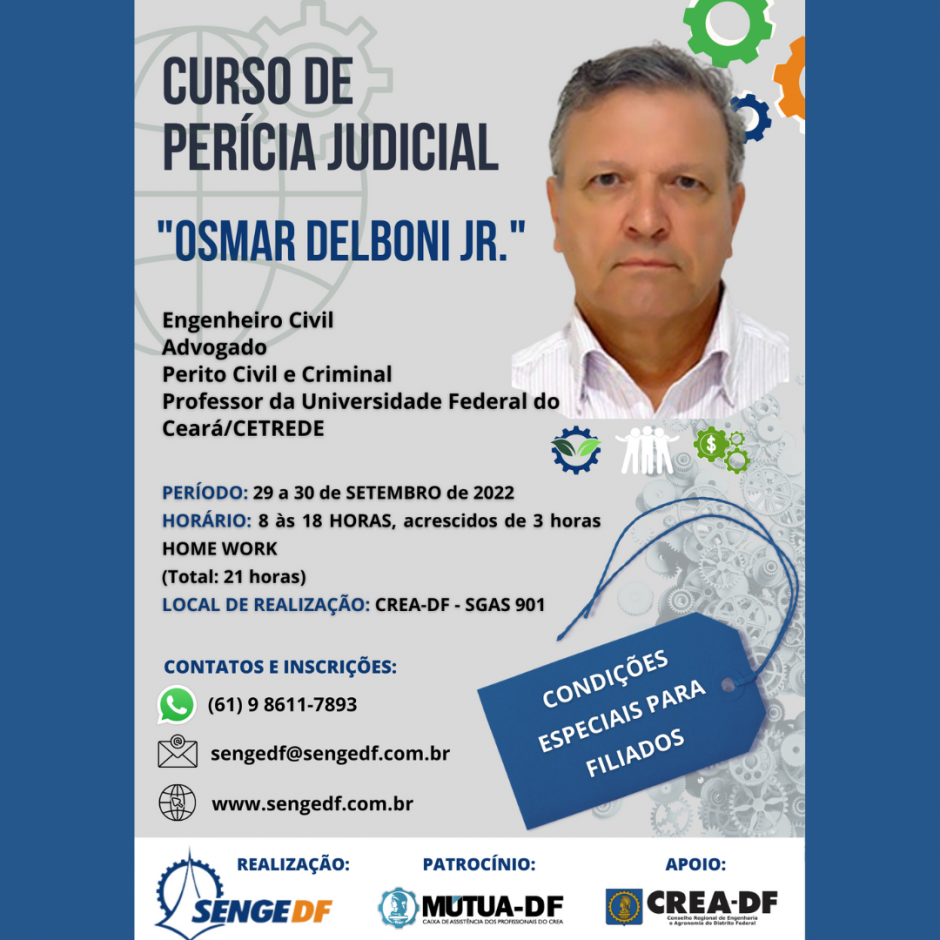 Nos dias 29 e 30 de setembro, de 8h às 18h, na sede do Crea-DF, acontecerá o Curso de Perícia Judicial com o eng. civ. e advogado Osmar Delboni Junior.