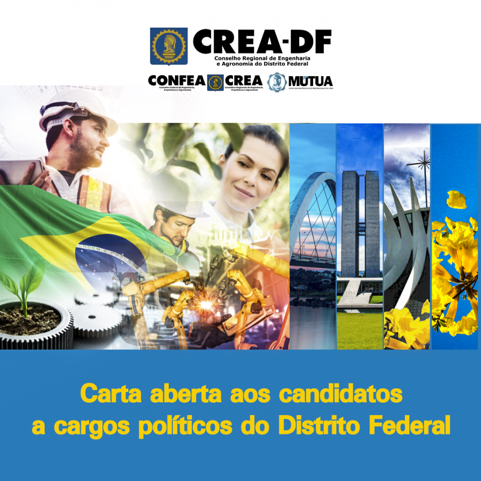 Dessa forma, o Crea-DF elaborou esta Carta Aberta aos Candidatos a Cargos Políticos do Distrito Federal, visando subsidiar as tomadas de decisões dos candidatos e contribuir com a formulação de propostas que coloquem nosso País e o Distrito Federal no rumo do crescimento e da geração plena de empregos.