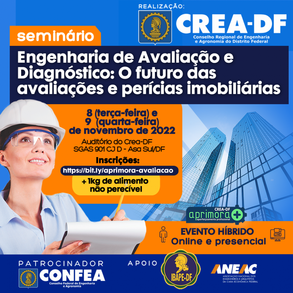 O evento será patrocinado pelo Confea e tem o apoio do Instituto Brasileiro de Avaliações e Perícias de Engenharia do Distrito Federal - IBAPE/DF e da Associação Nacional dos Engenheiros e Arquitetos da Caixa Econômica Federal.