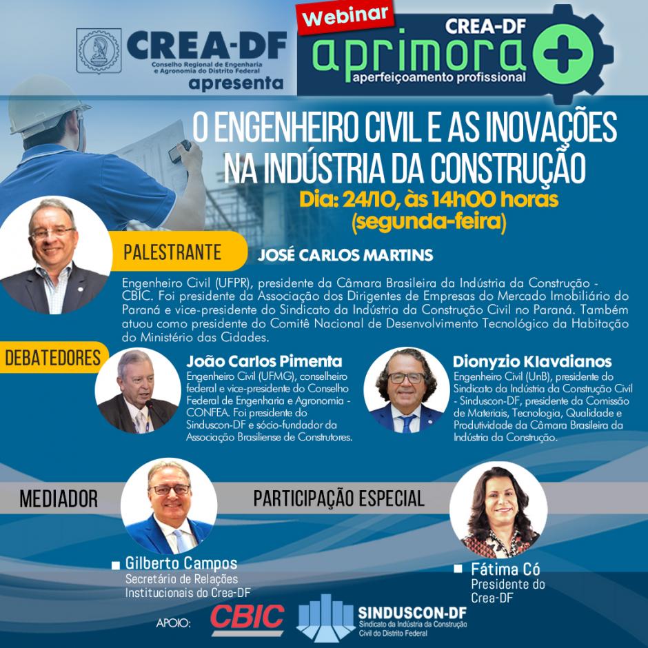 Em comemoração ao dia do Engenheiro Civil, da Construção Civil e do Patrono da Engenharia Civil Santo Antonio de Sant'Ana Galvão (Frei Galvão), celebrado em 25/10, Crea-DF promoverá, no dia 24 de outubro (segunda-feira), às 14h, a palestra "O Engenheiro Civil e as Inovações na Indústria da Construção", uma iniciativa do Programa Aprimora+.