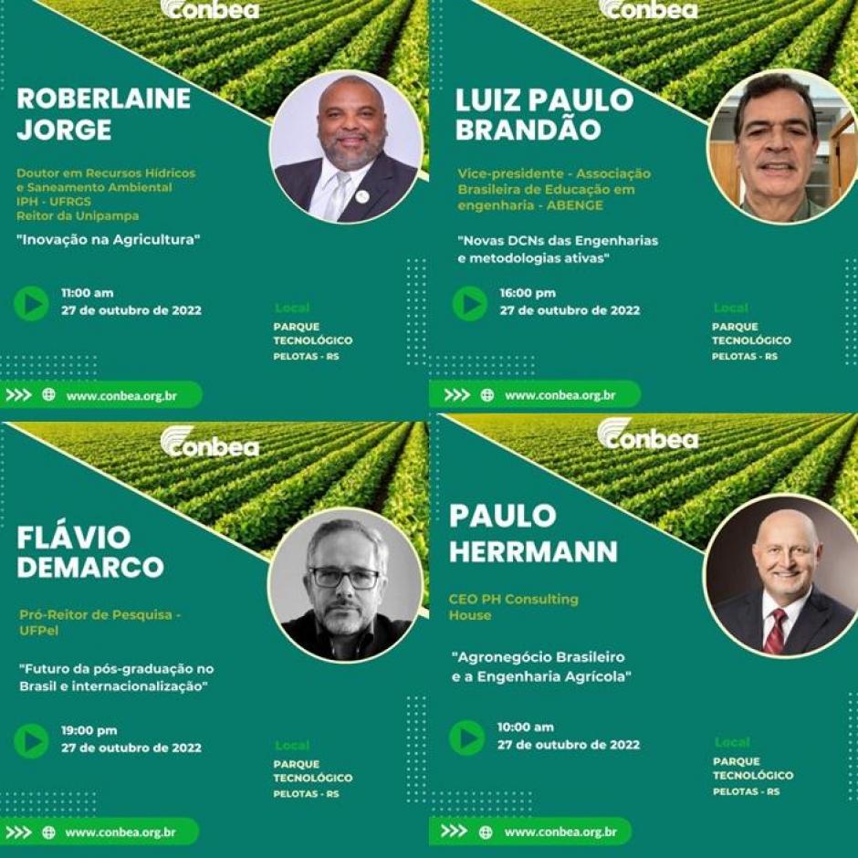 De 27 a 29 de outubro, Pelotas (RS) sedia o 51º Congresso Brasileiro de Engenharia Agrícola (Conbea). Com o tema "50 anos do profissional Engenheiro Agrícola: revisitando o passado para transformar o futuro", o evento promovido pela Associação Brasileira de Engenheiros Agrícolas (Abeag) deve reunir 500 participantes, entre profissionais, gestores, pesquisadores, professores e estudantes de graduação e pós-graduação no Pelotas Parque Tecnológico. O evento será totalmente presencial.