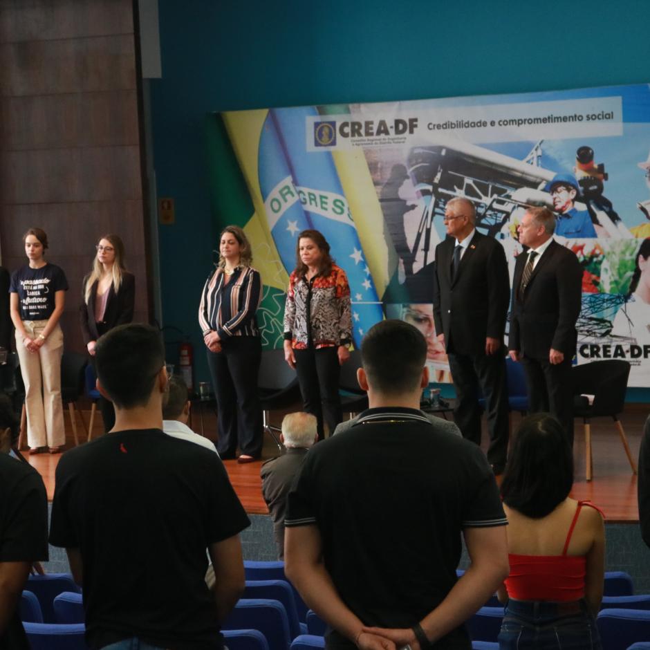 Na abertura, estavam presentes a presidente do CREA DF/Fátima Có, o presidente do SINAENCO DF/Eduardo Stalhofer, o diretor Geral da Mútua-DF/Arthur Milhomem, a diretora do Senge Jovem/Df Eng Diolívia Tibúrcio, a coord. do Crea Jr Nacional/Luana Matos, a coord. Adj do Crea Jr/Júlia Enéas, coord. do curso de Engenharia da Unip/Luis Correias.