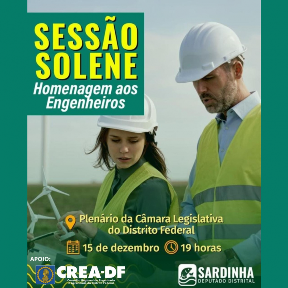 No dia 15 de dezembro, próxima quinta, a Câmara Legislativa do Distrito Federal promoverá Sessão Solene em homenagem ao Dia do Engenheiro, comemorado em 11/12.