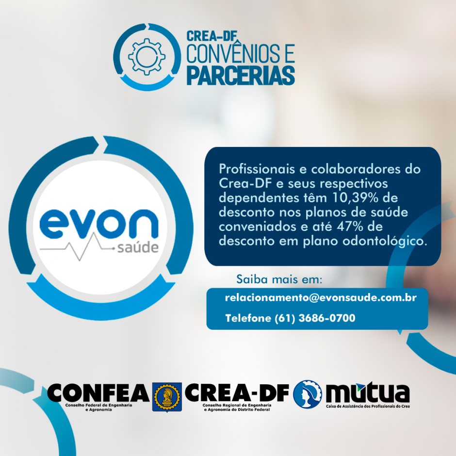 A Evon Saúde, empresa administradora de benefícios, e o Crea-DF firmaram parceria para concessão de descontos em planos de saúde e planos odontológicos para profissionais registrados no Crea-DF, colaboradores e seus respectivos dependentes.