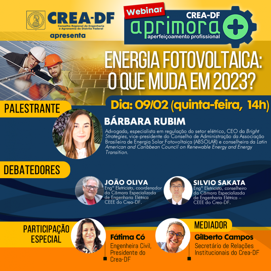 No dia 9 de fevereiro (quinta-feira), às 14h, o Programa Aprimora+ do Crea-DF receberá a advogada e especialista em regulação do setor elétrico Bárbara Rubim para falar sobre o tema "Energia fotovoltaica: o que muda em 2023?".