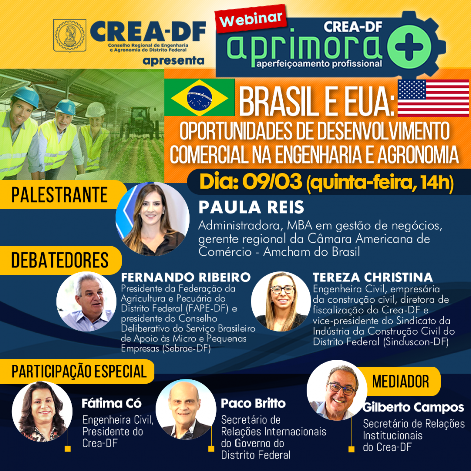 No dia 9 de março (quinta-feira), às 14h, o Programa Aprimora+ do Crea-DF receberá Paula Reis, administradora e gerente regional da Câmara Americana de Comércio - Amcham, para falar sobre o tema "Brasil e EUA: oportunidades de desenvolvimento comercial na Engenharia e Agronomia".