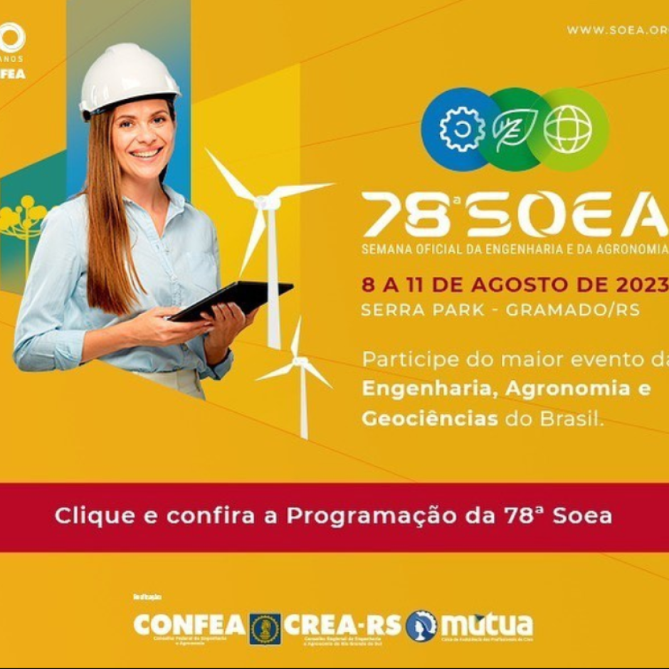 As 120 palestras da 78ª Soea não incluem as programações das querências do Espaço Inovação e do Congresso Técnico Científico da Engenharia e da Agronomia – Contecc. Com essas programações paralelas, somam-se, ainda, outras trinta palestras ao rol de atividades da 78ª Soea, sem contar as reuniões de entidades de classe. Sugere-se ao participante estudar a programação completa para que se planeje e não perca os assuntos de seu maior interesse!