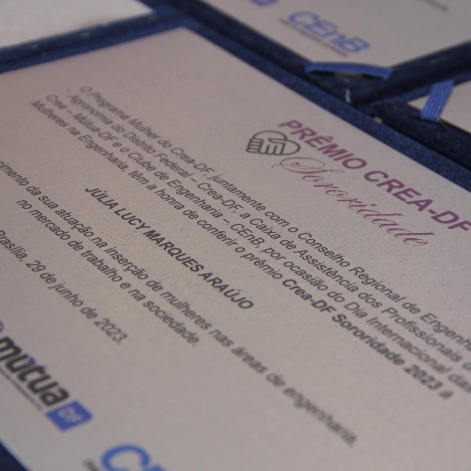 Na cerimônia, houve a entrega do prêmio "Crea-DF Sororidade", que visa reconhecer e destacar o trabalho de mulheres do Sistema Confea/Crea/Mútua, bem como mulheres com atuação a nível distrital, nacional ou internacional, que ao desenvolverem suas atividades profissionais ou pessoais, agregaram ações de sororidade visando a inserção das mulheres no mercado de trabalho e na sociedade.