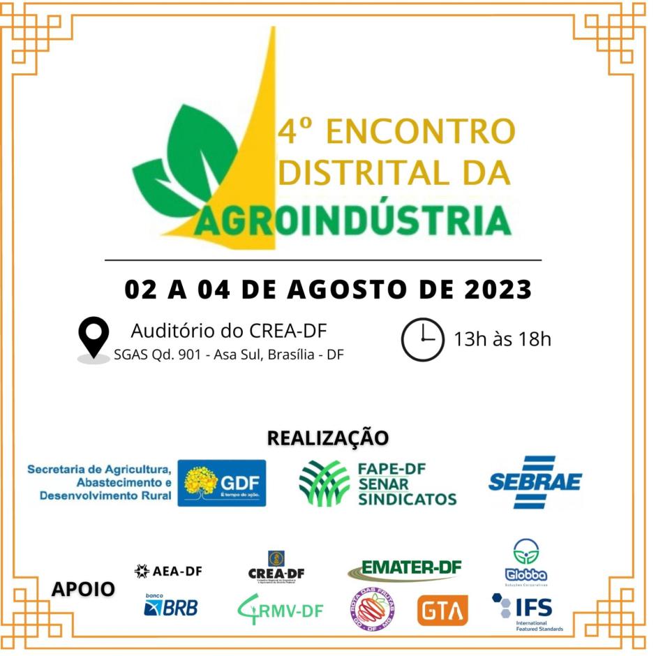 Já estão abertas as inscrições para o 4º Encontro Distrital da Agroindústria (EDA) que vai acontecer entre os dias 02 e 04 de agosto, das 13h às 18h, no auditório do CREA-DF, na Asa Sul. O EDA é evento constituído por palestras e debates multidisciplinares que tratam das atualizações acerca dos fatores tecnológicos, legais, higiênico-sanitário e socioeconômicos.