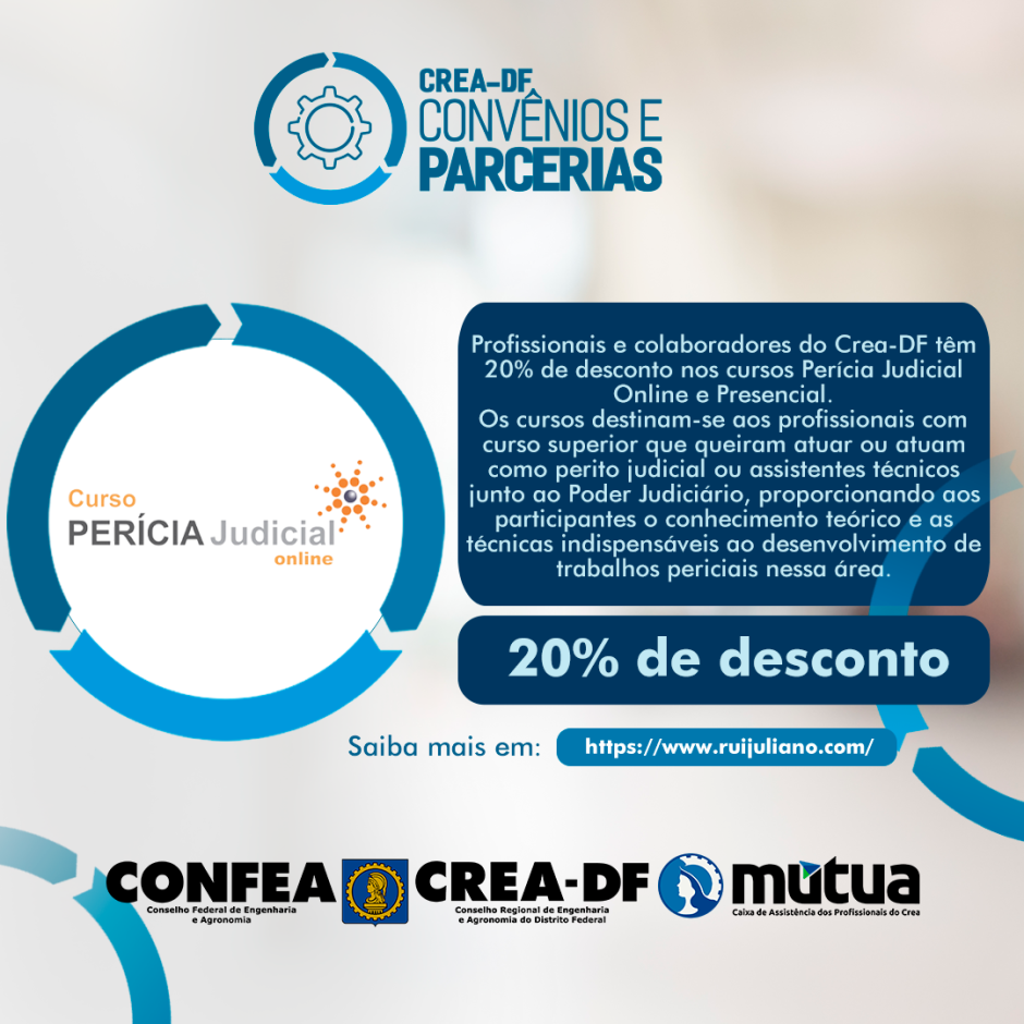 Profissionais registrados no Conselho, colaboradores e seus respectivos dependentes possuem 20% de desconto nos cursos Perícia Judicial Online e Perícia Judicial Presencial da @manualdepericias.