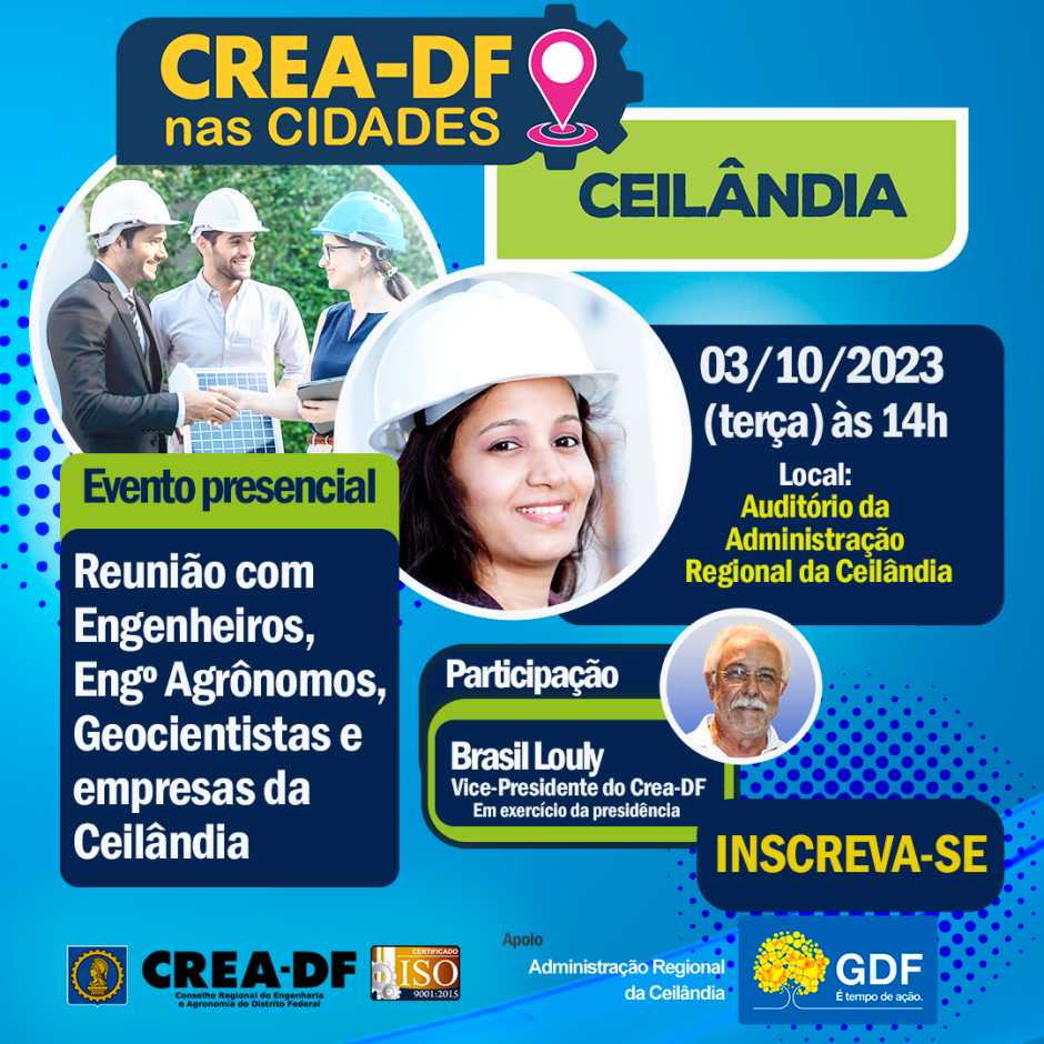 No dia 03/10, terça-feira, te esperamos às 14h00, no auditório da administração regional da Ceilândia, para um encontro com o presidente em exercício do Crea-DF, o eng. civil Brasil Louly e o administrador Dilson de Almeida.