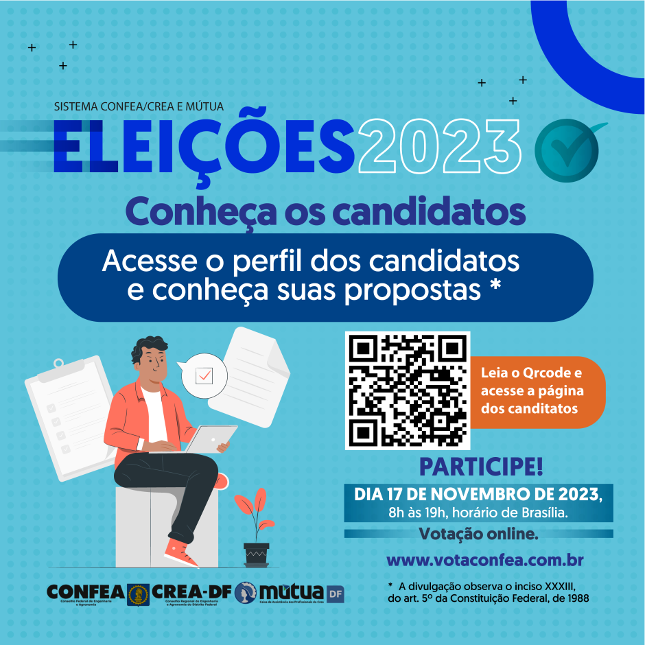 De acordo com a Decisão Plenária nº PL-1869/2022, as eleições serão realizadas no dia 17 de novembro de 2023 (sexta-feira), pela rede mundial de computadores, no período de 8h às 19h, no horário de Brasília-DF, sendo que todo profissional registrado e em dia com as obrigações perante o Sistema Confea/Crea até 30 (trinta) dias antes da data da eleição é considerado eleitor e votará na circunscrição do Crea onde quitou sua última anuidade, independente do seu registro originário ou locais onde possuir visto.