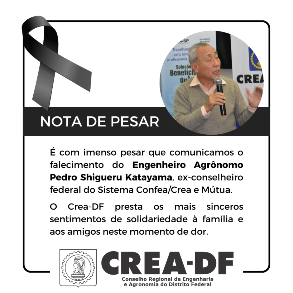 O presidente em exercício do Confea, eng. eletric. Evânio Nicoleit, expressou suas condolências à família. “O Sistema Confea/Crea e Mútua se solidariza com os familiares do engenheiro agrônomo Pedro Katayama. Destacamos ainda os relevantes serviços prestados por esse profissional para o Sistema”, disse o presidente Nicoleit.